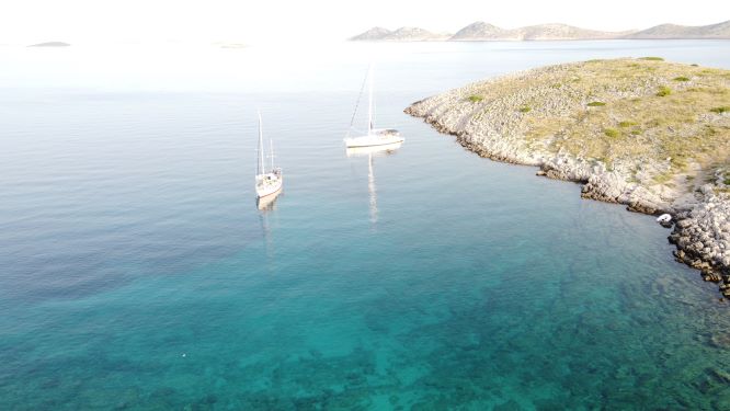 Zjutraj se z vice admiralom, ki je vsak dan bolj spretna s sidrnim vinčem. Sidro jo uboga, skoraj tako kot jaz J. Zjutraj dobim kavico in prižgem pipo miru, prelep pogled na Žut z vzhodne strani.