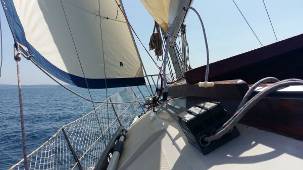 Ob izplutju je Boštjan zapeljal barko iz priveza ter jo usmeril po kanalu proti Devinskemu Gradu. Vetra je bilo ravno za vzorec. Modelska napoved vremena se je povsem zmotila in čez nekaj časa je potegnil Maestral. S pogledom na brezveterje je bila morala povsem na psu. Kaj kmalu smo že veselo vriskali, saj je merilec hitrosti pokazal nekaj malega čez 5 vozlov.