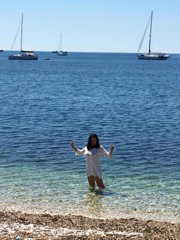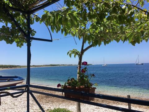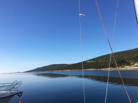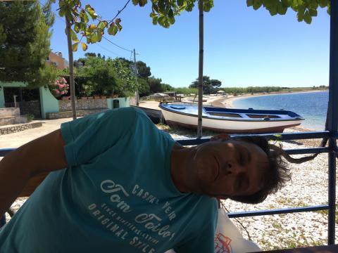 Prebudila sva se v prelepo jutro. Stopim na palubo in na drugi strani zaliva zagledam dva kavalirčka. Seveda mi je takoj jasno, da je nekje v bližini Mitja Zupančič. Z Boštjanom se odločiva, da greva na kavo v Unije. Spustiva gumenjaka in že odveslava proti obali. Malce naju je presenetil tok, vendar sva bila vseeno kot bi mignil na drugi strani.