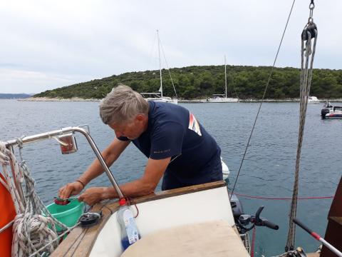 Dan je minil v ležernem stanju, nekaj kopanja, kuhanje zajtrka in tako sva jedla odlične palačinke. Alkoholni kuhalnik sprva ni dobro deloval saj je znotraj kabine preveč pihalo, moral sem zapreti glavno okno in palačinke so se lepo zapekle. Čez dan se je zaliv izpraznil in lahko sva se v miru prestavila na malce bolj zaščiteno mesto. Med pospravljanjem in pregledovanjem zaloge sem odkril še dve buteljki vina, takoj sva postala bolj vesela. Za pozno kosilo je Jože skuhal fuže z zelenjavo in poplaknila sva z dobrim merlotom.