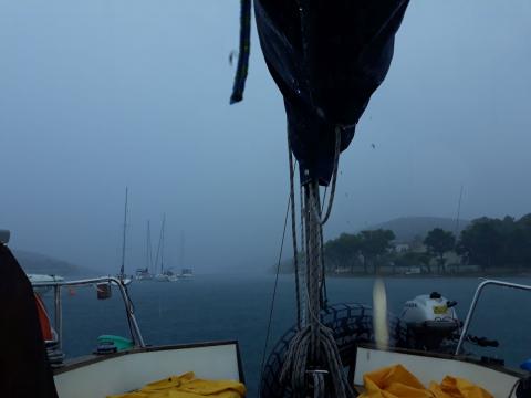 Sledi novi val neviht, vsi spremljamo DHMZ radarsko sliko in tokrat useka z jugovzhoda. Na sidrišču nas premetava dobre pol ure in sunki segajo vse do 30 vozlov. Predno začne deževati vidim na koncu Lošinja vodno trombo. Nad našim zalivom opazujem lepe oblake kako lepo so hitri, kar naenkrat vidim piš, ki prihaja točno na naše barke. Viceadmiralka še lepo slika, ko jo hitro napodim v podpalubje in useka sunek 34.5 vozla direktno v barko. Takoj se naša LILJa nagne in vse leti po tleh. Škatla s pipami polna tobaka, vse je po tleh. Začne se dež in to konkretno, kot da smo v sredini ciklona in zliva se.