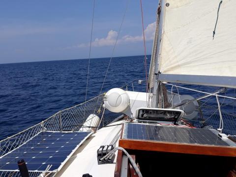 In že smo zunaj, Takoj razvijem vse »gate« kar jih imamo in letimo počasi a vztrajno. Mimo rta Savudrija se veter počasi prične krepiti, ulala, to mi deli. 5 vozlov brez problema, barka uboga le avtopilot ni pravilno nastavljen, nekaj se trudim prebirati navodila in nastavljati pilota, ni časa veter je v pol krme nimam časa, letimo.
