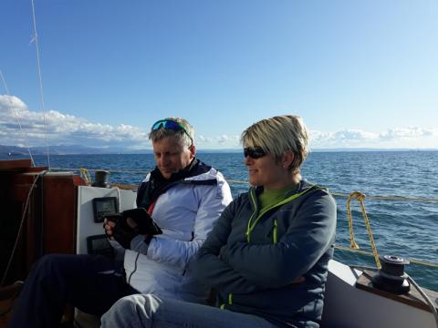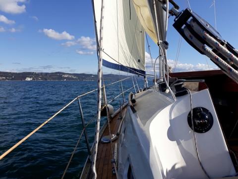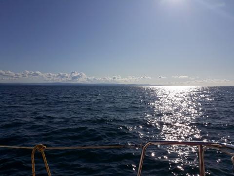 Veter pade in barčica se pozibava na valovih. Veter prične pihati najprej z juga nato z zahoda, valovi z vzhoda. Dobre pol ure je trajal rock&roll na vodi. Valovi se uskladijo z vetrom in že smo šibali. Dvignemo vsa jadra in s polnimi jadri križarimo vse do povratka v marino.