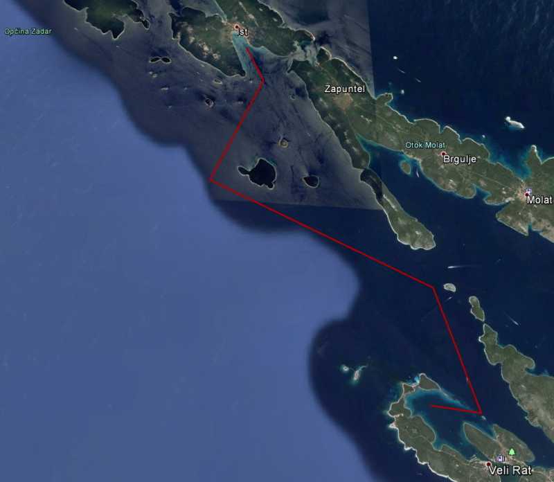 Veli rat - Ist, zgodnje jutranje jadranje. Dimitrij je odrinil že pred 6-to uro, jaz pa sem še malo pospala pod vplivom Nalgesina. Dve in pol urno jadranje v burji naju je prineslo na Ist. Privezala sva se na bojo, spila kavo in šla na obalo.Opravila sva manjši nakup, se sprehodila čez Ist do pomola, kjer pristaja trajekt, spila kavo in jo mahnila na Stražo (cca. 170m visok vrh). Ko sva prisopihala na vrh, se nama je odprl prekrasen razgled na vse strani. Po dobri uri hoje gor/dol, sva si privoščila mrzlo pivo, dva, tri... in malo malico (porcija čevapov za oba – pa je bila res mala) v lokalu Lako Ćemo!.Popoldne sva namenila kopanju, sončenju, branju.