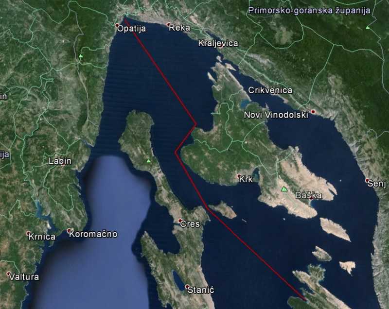 Rab - Opatija, zgodnje vstajanje. Pravzaprav je imel Dimitrij budnico, ko je začel dvigati sidro. Hitro pokonci in skok v vodo in odmotorizirala sva proti Krku. Popolno brezvetrje, ropotanje motorja in vročina. Za barko sva vlekla vrv in skakala s premca v vodo in se nato ujela za vrv. Super zabava in ohladitev. Plula sva ob Krku in iskala primeren privez. Vmes je padla seveda malica in skodelica kave. Zaradi lakote in vročine sva želela narediti premor, saj sva se vmes odločila, da bova noč preživela že kar v Voloskem.