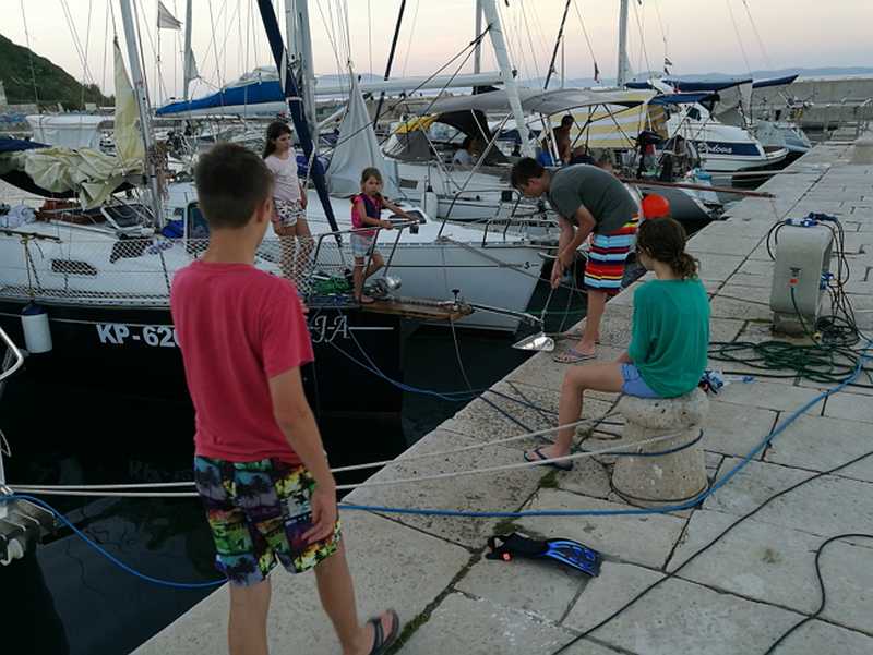 2. dan, PULA - SUSAK, ekipa je bila po prespani noči pripravljena in spočita. Vstali že pred sedmo uro, zato formalnosti s plačilom priveza ni bilo :) Potem nas je vodila proti Susku, kamor smo prispeli okoli dveh popoldne, otroci so šli hitro v vodo, kapetan pa si je privoščil bevando. Na Susku smo se tudi dobili s prijatelji z drugo barko, družba tako za otroke, kot tudi kapetana :)