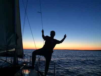 Zvečer ob 20:00 smo odrinili proti Žirjam. Pot mimo otokov Drvenik je bila začinjena z rahlim burnom, vendar ga je bilo premalo. Sredi noči sem se značel v Novigradskem morju in zjutraj smo že bili pred otokm Žirje. Želja po sidranju v zalivu Tratinska se nam ni uresničila. Bark v zalivu je bilo ogromno ob tem pa je bila napoved SW do S in zaliv ni varen pred južnimi vetrovi. Po posvetu z ekipo smo se odločili jadrati vse do zaliva Pantera na Dugem otoku. Z južnim vetrom smo v 12 urah prispeli na Dugi otok.