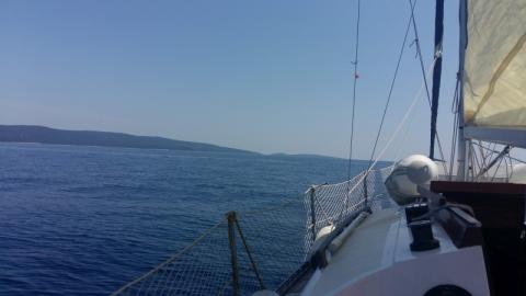 Brez točno določenega cilja smo se odvezali in z vsemi jadri zapluli naproti novim dogodivščinam. Malce me je skrbelo, ker so pričeli pihati vetrovi iz južnih smeri (SE), kako bomo mi z našo maldo posadko v orco v valove No, vsak strah se je izkazal povsem neupravičen, med Lošinjem in Malimi in Velikimi Srakanama je letelo kot za šalo. Oskar in Ester sta si našla priročen kotiček v kokpitu, kjer sta se igrala, Alenko sem posadil na bok barke in jadrali smo kot je treba.