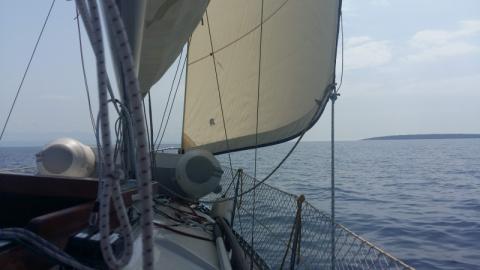 Po dobro prespani noči smo zarana odrinili proti Olibu. Pihala je šibka NE in hitro sem dvignil vse gate ter jo počasi maširal proti Olibu. Kot zakleto, zmanjka vetra tako da smo skoraj stali na miru. Nastavim genaker in lepo se napne ter že šibamo kot za šalo.