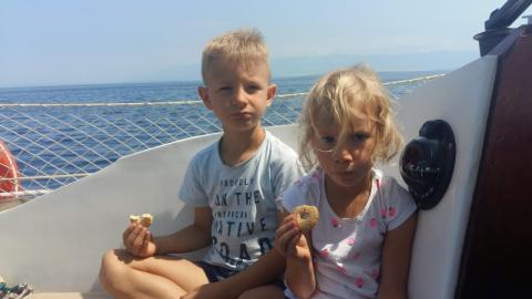 Jadro je super skoraj ne potrebuješ drugega jadra. No, pri 10 vozlih burje ga je bilo že malce preveč in nisem ga še navajen. Mularija se igra po, na in v barki tako da je zelo veselo. Moj vice admiral je prebiral knjigo ter žagal drva.
