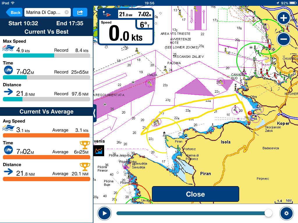 Do Debelega rtiča smo se bolj cjazili nato pa je se je NW lepo okrepil in z vsemi jadri smo jo mahnili proti Piranu. Ob mrzlem pivu in dobri družbi je čas hitro minil. Fino trimanje glavnega jadra in floka je potekalo gladko, saj nam je četrti član posadke lepo služil. Obrat v Piranskem zalivu in s pol krmo nazaj proti Kopru. Vmes smo malce zavili v orco, da smo jo nagnili. Skupaj smo prevozli 21 NM in največja hitrost je bila 4.9 vozla