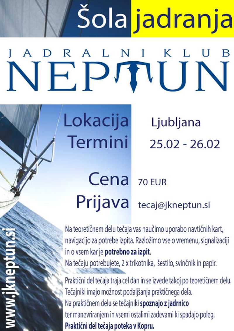 Teoretični del tečaja traja 2 dni v popoldanskih urah (16:30 - 21:00) v Ljubljani (Slomškova ulica 12) ali Črnučah ( Dunajska cesta 367). Na tečaju vas naučimo uporabo navtičnih kart, navigacijo za potrebe izpita. Razložimo vse o vremenu, signalizaciji in o vsem kar je potrebno za izpit. Na tečaju potrebujete, 2 x trikotnika, šestilo, svinčnik in papir.